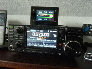 Ein Leistungstest muss nicht zwingend mit HF erfolgen. Man kann genauso gut Gleichstrom oder niederfrequenten Wechselstrom verwenden. Leider hatte ich für die 100V, die erforderlich sind um an einem 50Ω Widerstand 200W umzusetzen, weder ein passendes Netzteil noch einen regelbaren Transformator zu Verfügung. Mein Bild 10 Belastungstest mit dem IC 7300 TRX (ICOM IC 7300) erzeugt zwar etwa 100W HF aber das wollte ich ihm über mehrere Minuten Dauer nicht zumuten. Ersatzweise habe ich deshalb einen Dauertest mit 70W über 3 Minuten gemacht. Dabei wurde der Kühlkörper der Dummy-Load gut handwarm. Mangels Infrarotthermometer kann ich eine genauere Temperaturangabe ebenfalls nicht machen. Ich hätte aber keinerlei Bedenken, die Dummy-Load mit den vollen 200W für ca. 1 Minute zu belasten, wenn sie danach wieder abkühlen kann.