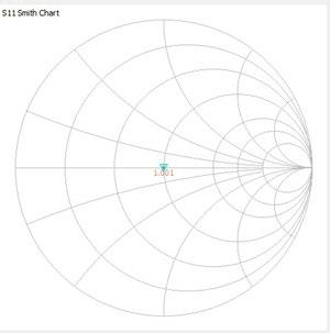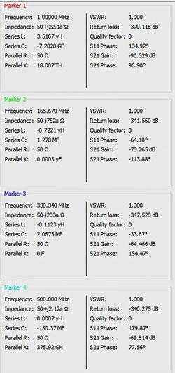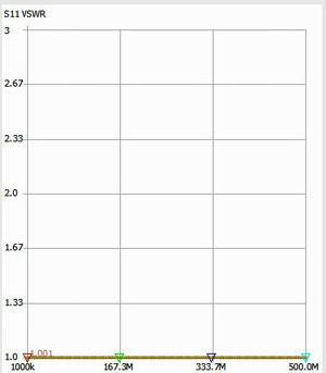 Bild 7 zeigt das SWR und Bild 8 die Impedanz im Smith-Diagramm jeweils im Frequenzbereich von 1 bis 500 MHz. Wenn man nicht ganz genau hinschaut, sieht man nichts. Das soll bzw. muss sogar so sein. Die SWR-Anzeige deckt sich mit der Linie für SWR=1 und die Impedanz hält sich im ganzen Bereich sehr eng an den 50Ω-Punkt. Wie eng zeigen beispielhaft die konkreten Werte für 1 und 500 MHz sowie zweier zufällig gewählter Frequenzen dazwischen in Bild 9. Auch die kleine Schlamperei bei der internen Verdrahtung, macht sich messtechnisch nicht bemerkbar. Ich hatte mir die Arbeit durch die Verwendung einfacher Drähte erleichtert. Korrekt hätte ich natürlich ein Koaxkabel verwenden müssen. An diesen Messergebnissen gibt es absolut nichts auszusetzen. Damit kann man sehr zufrieden sein.